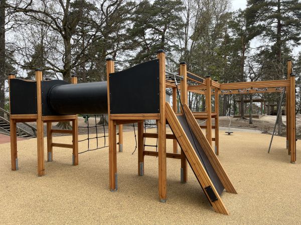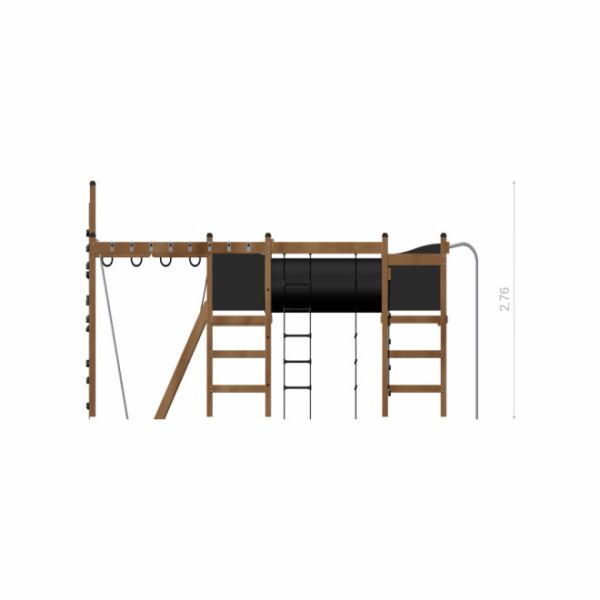 See mänguväljak on valmistatud kvaliteetsetest materjalidest, nagu lehisepuit, roostevaba teras ja tsingitud teras, mis tagavad vastupidavuse ja pikaealisuse. Kasutatud on ka taaskasutatud HDPE materjali ning tugevdatud ja pehmet PP köit, mis koos libisemisvastase veekindla vineeri ning roostevabast terasest kettidega moodustavad turvalise ja usaldusväärse konstruktsiooni. PP ja PE materjalid lisavad vastupidavust ja hooldusmugavust.