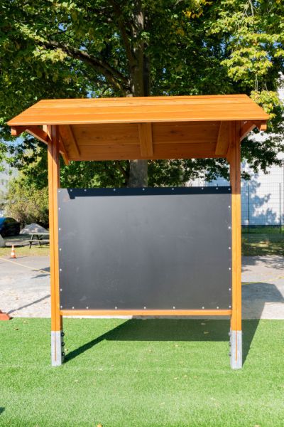 Sobib suurepäraselt parkidesse, koolide hoovidesse või avalikesse vabaajaaladele, kus on vaja nii varju kui ka infotahvlit. Must tahvel võimaldab mugavalt teateid, joonistusi või õpetlikke materjale esitada, rikastades õues toimuvat tegevust.
